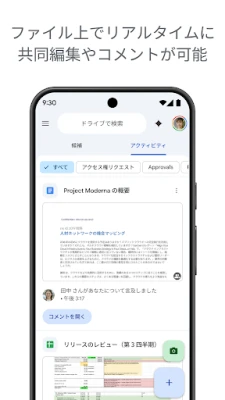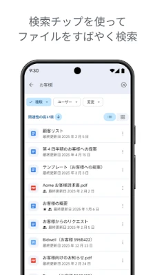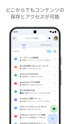Google ドライブでは、必要な情報を素早く見つけ出すための強力なツールが揃っています。ファイル名やコンテンツによる詳細な検索、種類や最終更新日でのフィルタリング機能により、重要なファイルにはいつでもスムーズにたどり着けます。チームや友人との共同作業も思いのまま。ファイルやフォルダの共有設定やアクセス権限の管理も直感的に行えます。また、インターネットに接続できない場所でもコンテンツを閲覧できるオフライン機能や、ファイルの重要な更新を知らせる通知機能も充実。Androidタブレットでは、分割表示やドラッグ&ドロップといった機能で、さらに快適な作業環境を実現します。