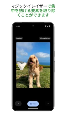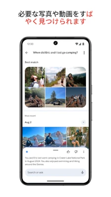 Google フォトの高度なAI搭載ツールが、あなたの写真を驚くほど簡単に生まれ変わらせます。数回のタップで、邪魔な写り込みを「消しゴムマジック」で消し去ったり、ぼやけた画像を鮮明に修正したり、ポートレートライトで光と影を思いのままに調整したり。さらに、探したい写真を見つけるのも直感的。「健と私が笑っている写真」や「山と湖でのカヤックの旅」のように、自然な言葉で説明するだけで、膨大なライブラリの中から目的の瞬間を瞬時に見つけ出せます。